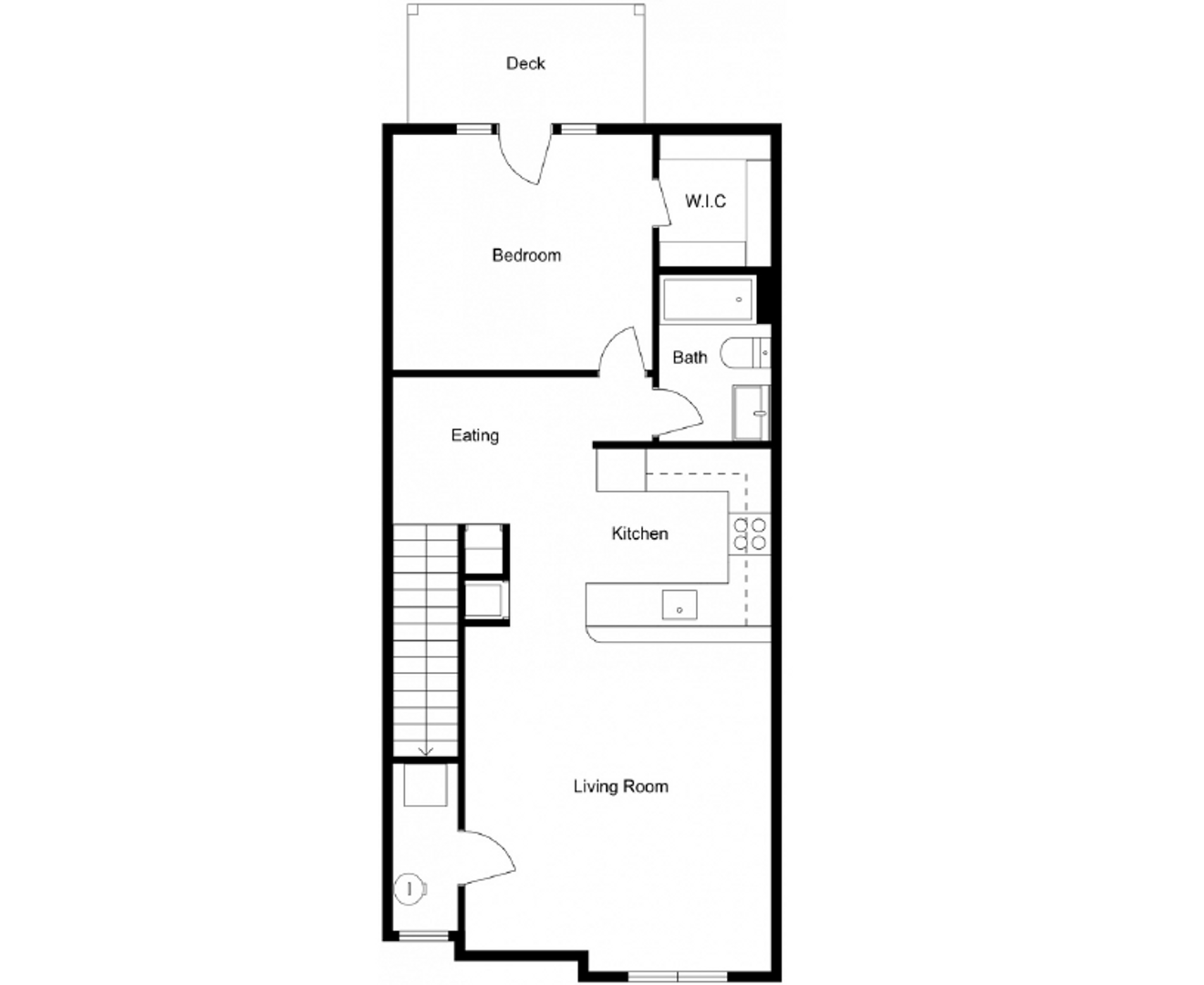 Second floor (walk-up) 1-bedroom apartment home with stainless steel appliances, carpet in the bedroom, and walk in closet in the bedroom.